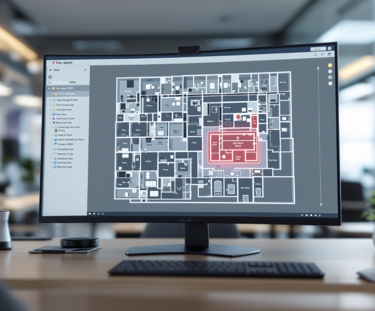 Ugunsdrošības sistēmu vizualizācija datorā: skaidrs ēkas plāns ar zonām un ierīcēm (stāvs, telpa, ierīces nr.).